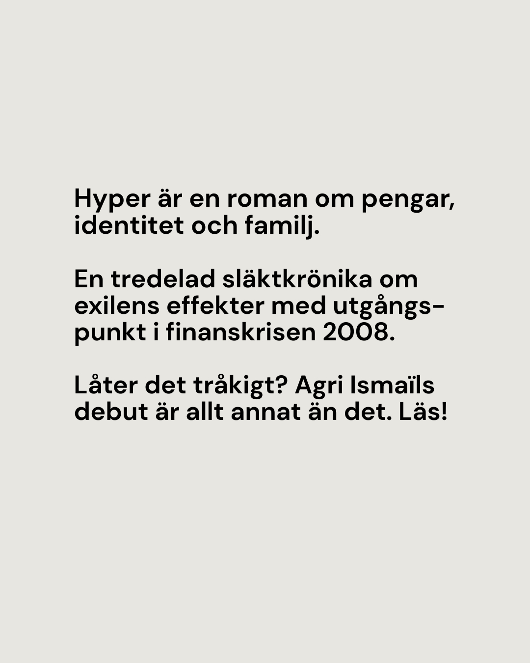 Det här tycker vi är topp tre bästa böcker 2025! Hyper är en roman om pengar, identitet och familj. En tredelad släktkrönika om exilens effekter med utgångspunkt i finanskrisen 2008. Låter det tråkigt? Agri Ismaïls debut är allt annat än det. Läs! Du kommer inte att bli besviken.